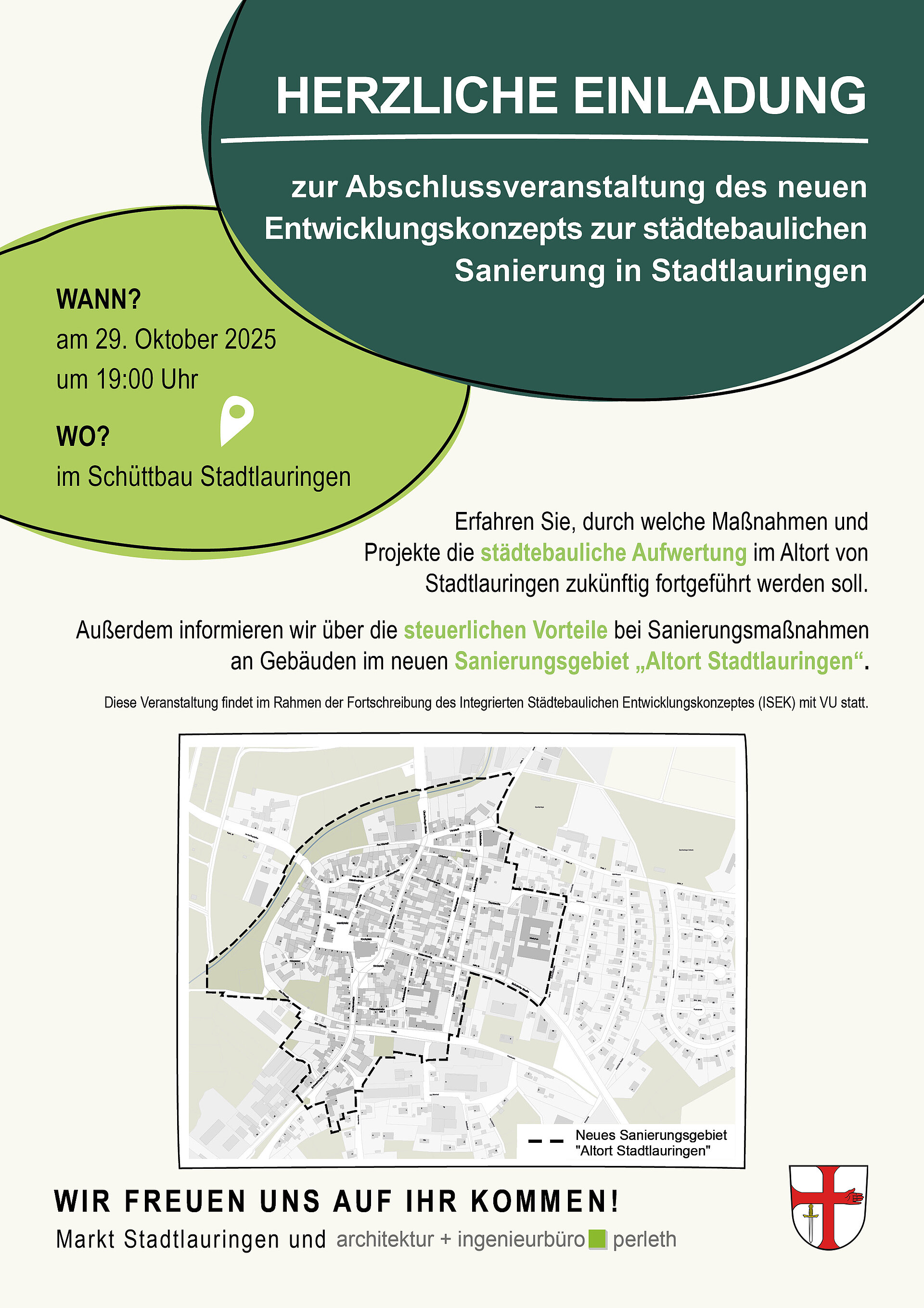 Fachwerkromantik, Schlösser, große und kleine Sehenswürdigkeiten, zahlreiche Vereinsaktivitäten, eine Verwaltung, die sich als Dienstleister versteht, interessante Bau- und Wohngebiete, ein aktives Gewerbe und unterschiedlichste Freizeitmöglichkeiten prägen das Bild des Marktes Stadtlauringen mit den Gemeindeteilen Altenmünster, Ballingshausen, Birnfeld, Fuchsstadt, Mailes, Oberlauringen, Stadtlauringen, Sulzdorf, Wettringen und Wetzhausen. Schau’n Sie mal rein!