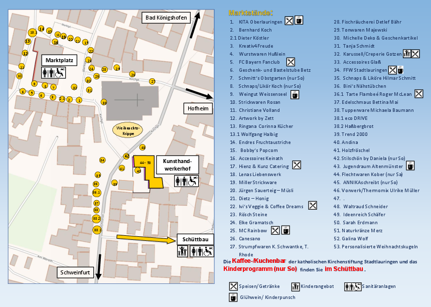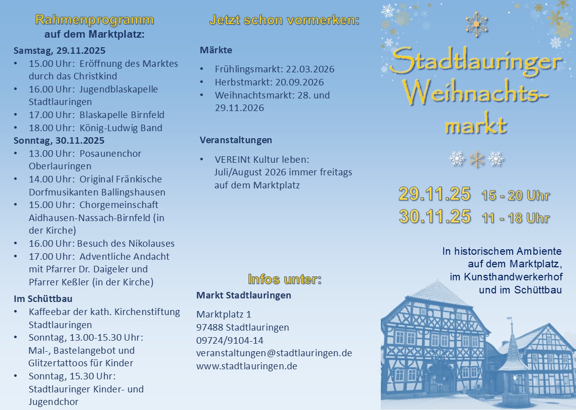 Dreimal im Jahr finden in historischem Ambiente in Stadtlauringen unsere Märkte statt - Frühlings-, Herbst- und Weihnachtsmarkt. Um die 70 Marktstände mit Blumen und Gestecken, Dekoartikeln, Schmuck und Kunsthandwerk verteilen sich vom Marktplatz über den Kirchplatz/Kunsthandwerkerhof bis hin zum Schüttbau. Zahlreiche Essensangebote sorgen für das leibliche Wohl und wechselnde Highlights, wie beispielsweise Blaskapellen und Kinderangebote runden das Programm ab. Tausende Besucher sind bereits begeistert und kommen jedes Jahr wieder. Seien auch Sie dabei!